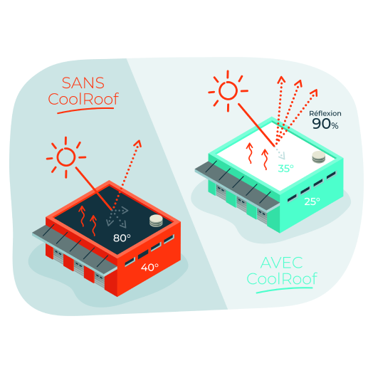 Le Cool Roofing est une solution pour réduire les îlots de chaleur urbains (ICU). En réfléchissant une grande partie des rayons solaires il abaisse la température des bâtiments et de l’air ambiant.